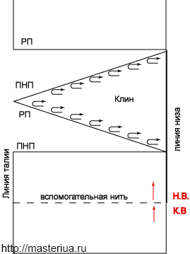 Начинаем вязание всегда с середины прямого участка (середина спинки), при этом слева у нас всегда располагается - ЛИНИЯ ТАЛИИ, а справа - ЛИНИЯ НИЗА. Провязываем первую половину прямого участка и выводим иглы в ПНП, затем начинаем возвращать в РП группы игл (по расчету) справа налево, пока не введем все иглы до линии талии. Далее выводим иглы в обратном порядке в ПНП (слева направо). Выполнили один клин, при этом по линии талии у нас длина осталась преждней, а по линии низа длина полотна увеличилась на столько рядов, на сколько был вывязан участок частичным вязанием. Вернем в РП все иглы и вяжем прямой участок полное количество рядов, затем частичным вязанием вставку-треугольник. Таким образом, надо связать шесть клиньев и закончим вязание второй половиной первого клина (середина спинки). Так как вязание начинали с бросовой нити и закончили её, открытые петли первого и последнего ряда соединяются горизотальным трикотажным швом. |