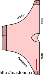 В некоторых случаях, такое же изделие можно связать, взяв за начало вязания середину спинки (соотв. переда). Тогда вязание начинаем с набора петель вспомогательной нитью и далее вяжем рабочей нитью от середины к нижней кромке рукава, выполняя убавки по боковому шву. Затем полотно поворачиваем, убираем вспомогательную нить и надеваем открытые петли на иглы машины. Вяжем вторую половину детали в зеркальном отражение. |