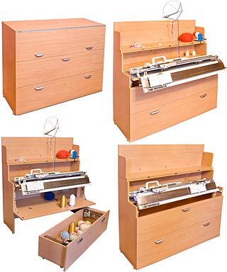 - Стол-комод для тех, кто любит порядок или, если в доме маленькие дети. С обычнои состояии он похож на комод, но при необходимости его можно разложить и работать. В такой объемный стол можно, кроме машины, убрать много чего полезного. Подобные комоды можно купить (тут или тут) или заказать подобный у местных умельцев. Нужно заметить, что это стол-комод не только имеет усиленную выдвигающуюся полку, на которой закреплена машина, но и несколько пар роликов, благодаря чему его несложно перемещать в то или иное удобное место. Кроме того, на такой комод можно установить замок, чтобы дети его не открыли. |